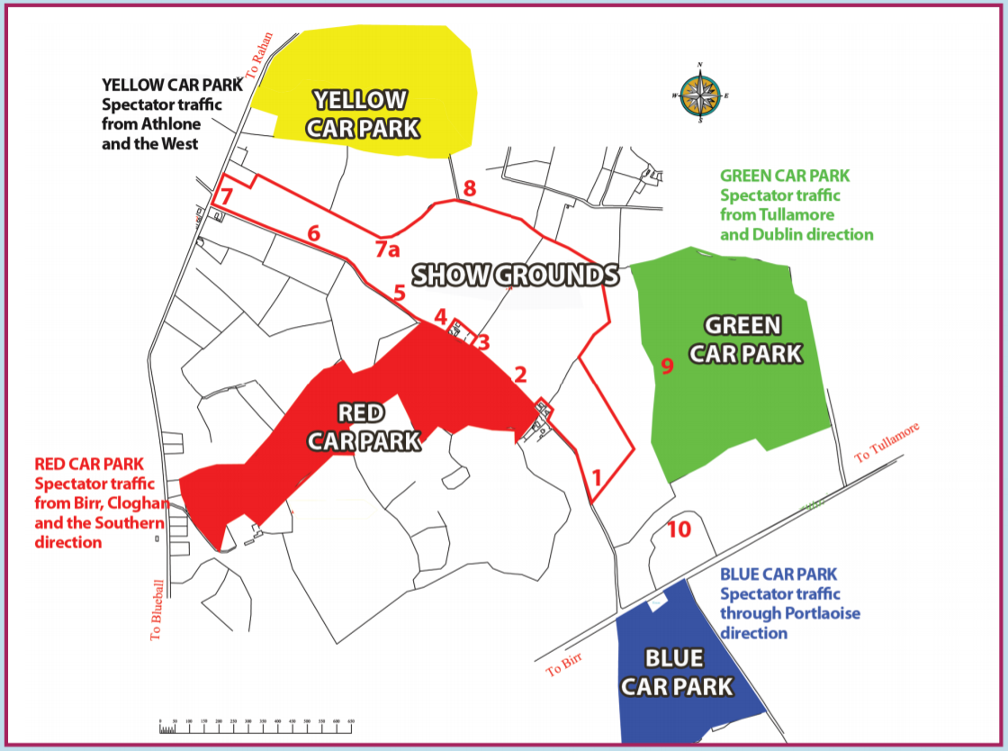 (3)Birr Car Park (Red) has an approximate area of 52 acres and will cater for traffic approaching the Event from the South and South West. In addition an extra 50 acres of car parking space is available in an adjoining field.